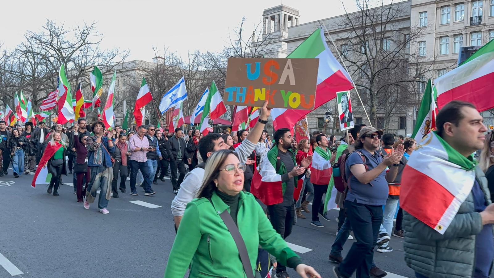 Marsz główny: Około 1600 osób wyruszyło z Placu Poczdamskiego (Potsdamer Platz) w kierunku Bramy Brandenburskiej. Celem manifestacji, zorganizowanej przez zwolenników przebywającego w USA byłego irańskiego następcy tronu Rezy Pahlaviego, jest budynek ambasady Stanów Zjednoczonych.